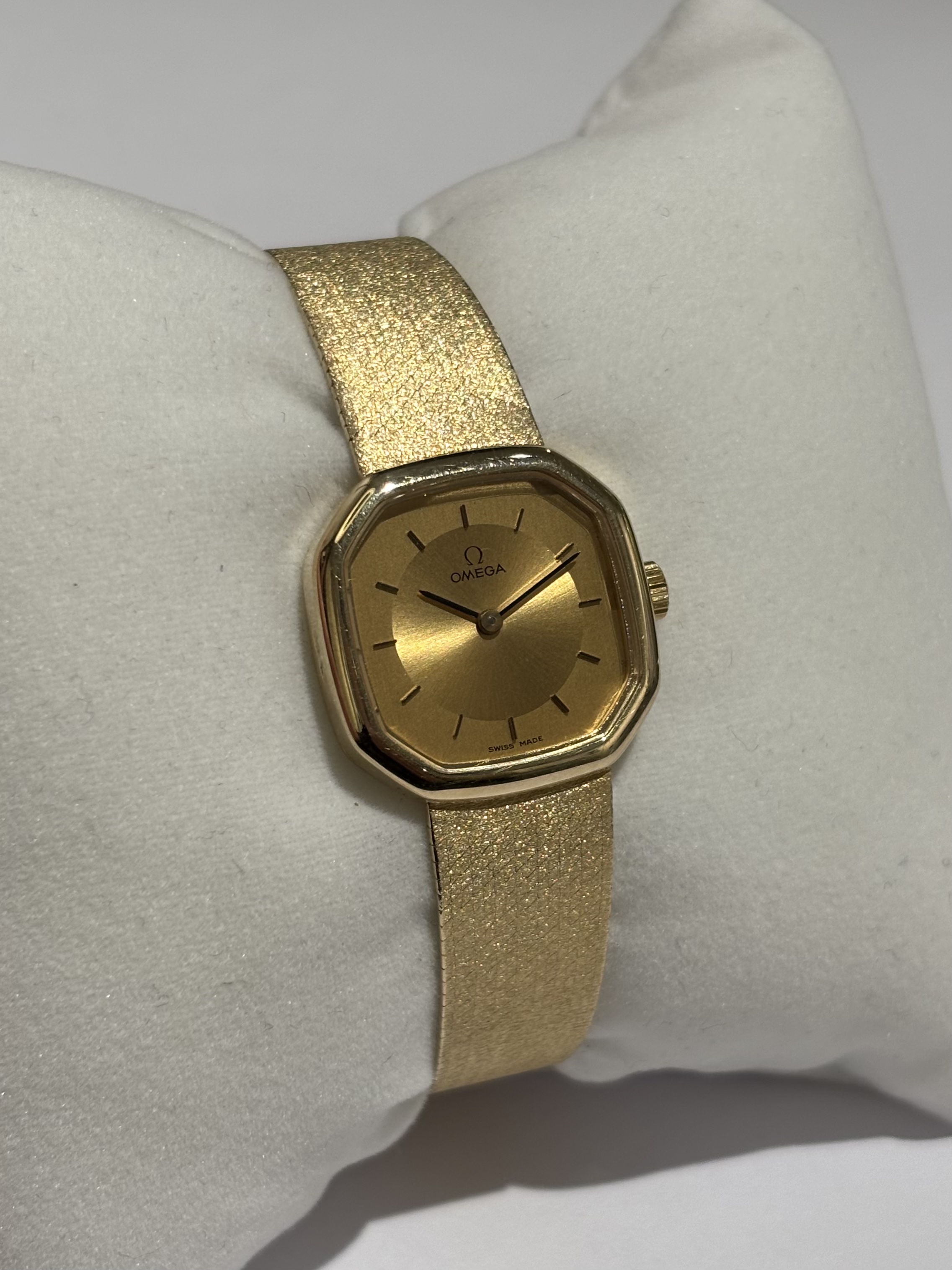 14 karaats geelgouden Omega, cal. 625, met een milanese band. Het is een mooi klassiek 8-kant model, met een kast van 23mm.
