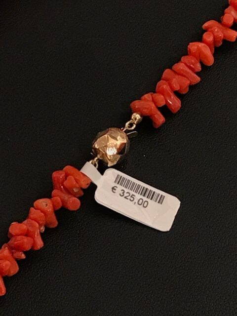 Mooi van kleur is deze bloedkoralen ketting met gouden siersluiting. Dit is een zogenaamd "bol" sluiting.