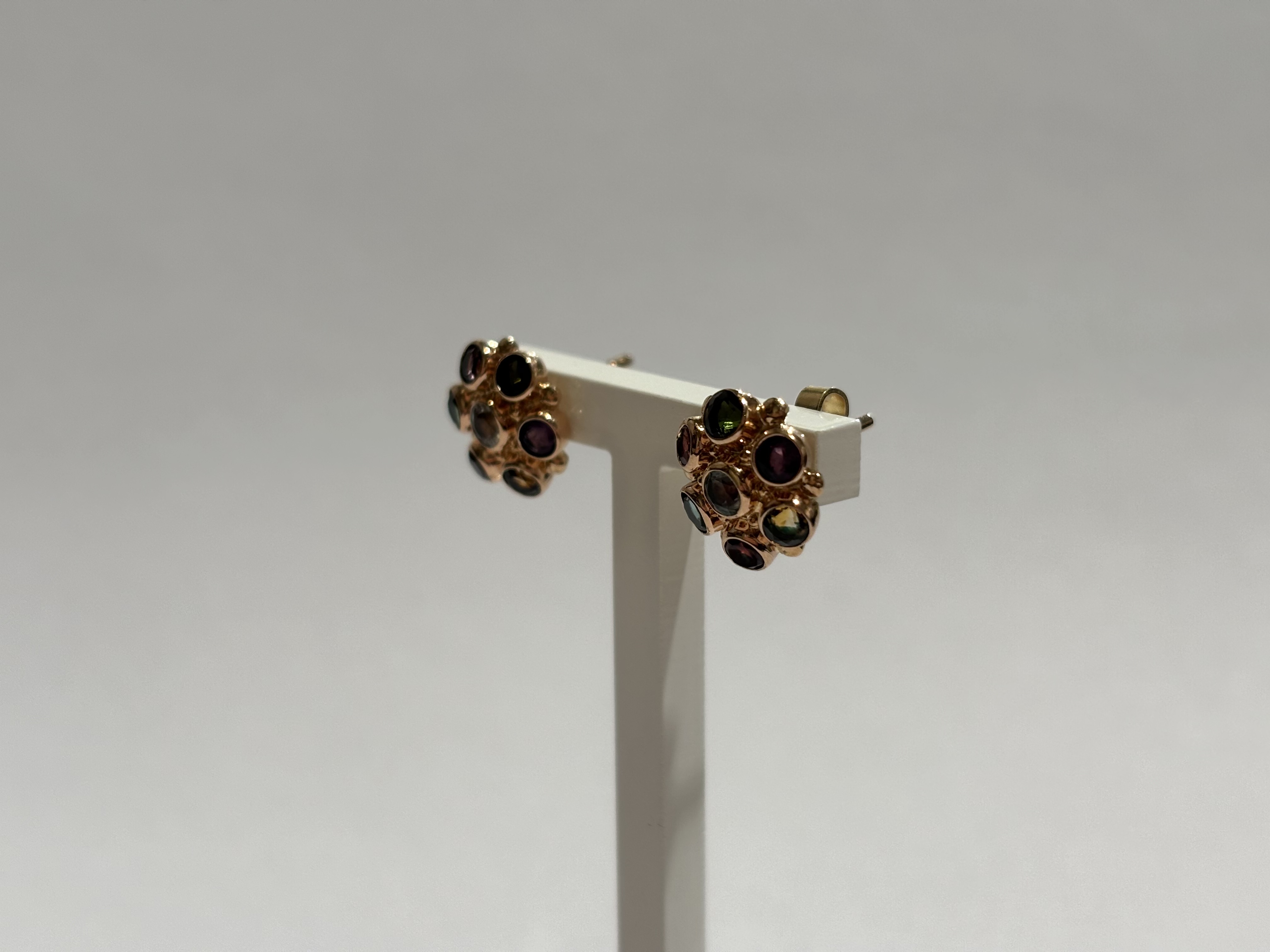 Deze prachtige 14 karaats gouden vintage oorknoppen zijn voorzien van diverse edelstenen, onder andere: Toermalijn, Amethist, Topaas en Rookkwarts.